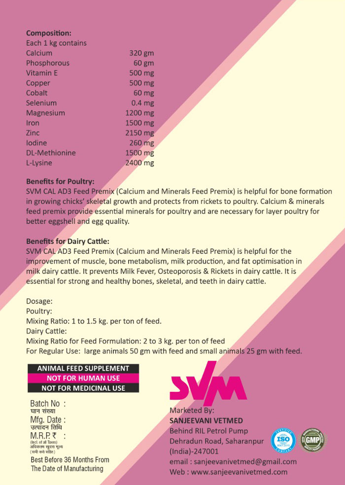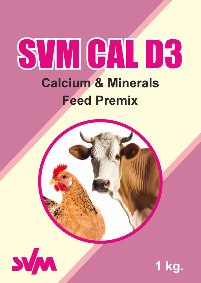 SVM CAL AD3 Feed Premix (Calcium and Minerals Feed Premix) is helpful for bone formation in growing chicks skeletal growth and protects from rickets to poultry. Calcium & minerals feed premix provide essential minerals for poultry and are necessarv for laver poultry for better eggsne an egg qua.